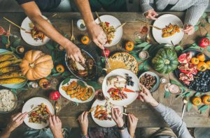 Flat-lay of friends feasting at Thanksgiving Day table with turkey February 18, 2021 By Διονύσης Φέξης
